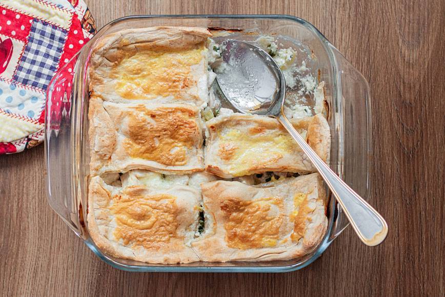 - Выложить курицу в форму для запекания. Слоёное тесто раскатать по размерам формы. Накрыть курицу тестом. Проколоть его в нескольких местах, чтобы выходил пар. Смазать желтком и печь при температуре 180 градусов около 15 минут.