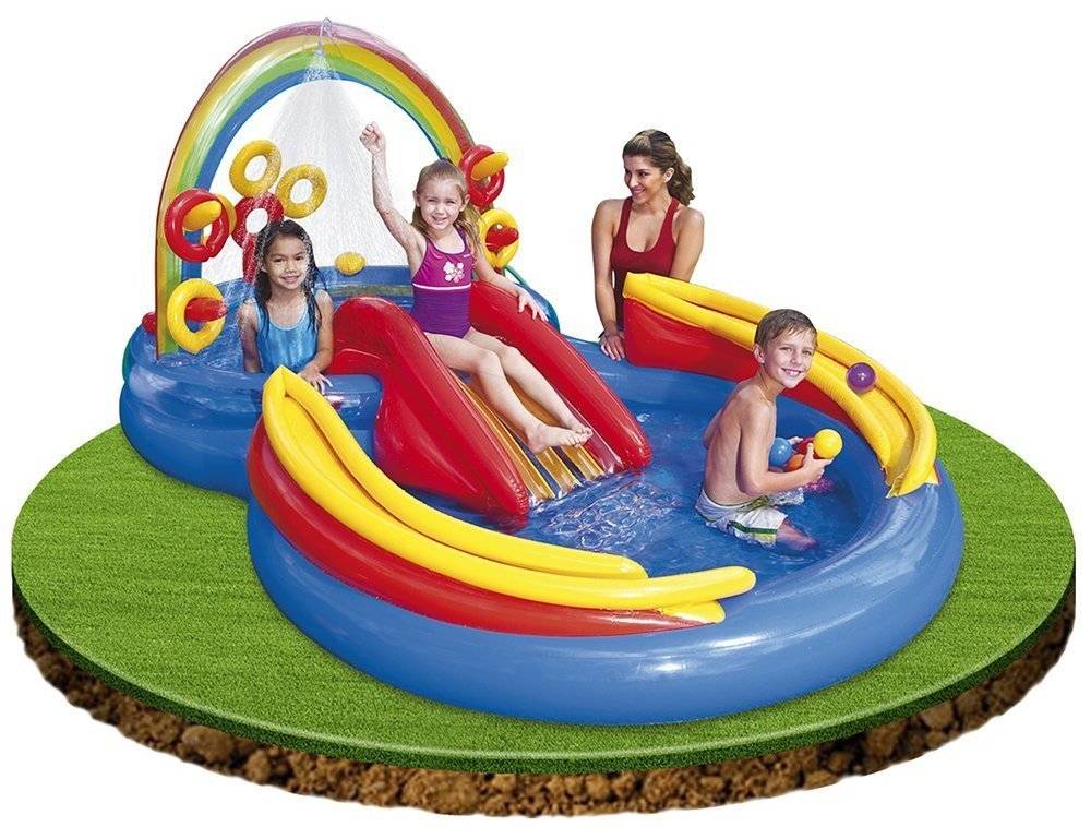 Этот игровой комплекс с лесенкой, горкой и неглубокой чашей требует много места: его длина и ширина 285х190 см, а высота составляет 230 см. Водяной насос подаёт струю через пушку, что добавляет веселья необычному домашнему аттракциону, способному принять гостей общим весом до 136 кг, а это целая компания детей.