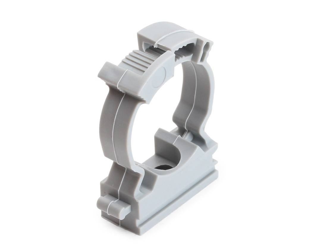 Клипсы применяют для труб небольших диаметров, которые с помощью дюбелей крепятся в стене или потолку. Выпускают две разновидности клипс: открытую и с фиксатором-защёлкой. Второй вариант предпочтительнее для крепежа к потолку, так как исключает «выскакивание» из крепежа.
