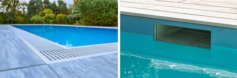 3. Бассейн может быть переливного или скиммерного типа. В первом случае вода через бортик переливается по желобу в систему фильтрации и переливной резервуар для последующего возвращения после очистки. В скиммерном варианте вода из ванны забирается через встроенные в стенки устройства.