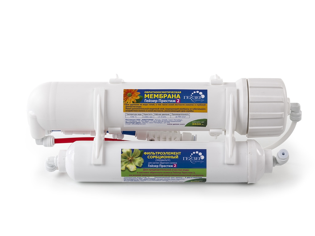 Обратноосмотические системы фирмы Гейзер строятся на базе классических моделей – аналогичные товары можно встретить у большинства производителей бытовых фильтров. Такие конструкции имеют три предфильтра на первом уровне, помещаемые в колбы с крышками, на втором уровне находится корпус мембраны с мембраной, постфильтр. Также может быть минерализатор, насос повышения давления и т.д. – в зависимости от модификации. В качестве накопительного бака применяется гидроаккумулятор с резиновой диафрагмой, разделяющую воздушную и водяную камеру. В качестве компактных решений предлагается использование In-Line картриджей и мембраны в корпусе. Этот вариант актуален для воды без значительного содержания механических примесей и хлора.