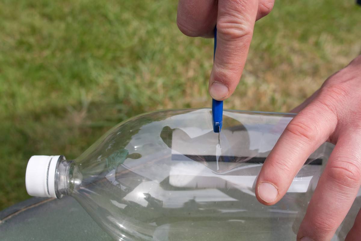 В бутылке делаются отверстия с помощью раскаленного гвоздя или шила. Их расположение зависит от выбранного способа размещения бутылей. При вкапывании горлышком вниз протыкаются пробка и стенки, при размещении дном вниз отверстия делаются в нем. Чем больше отверстия, тем активнее влага будет поступать в почву.