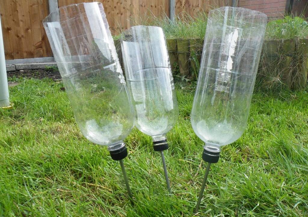 Дно бутылки можно заранее срезать или оставить неповрежденным: в последнем случает бутылку придется извлекать каждые несколько дней, скручивать наконечник и заливать воду.