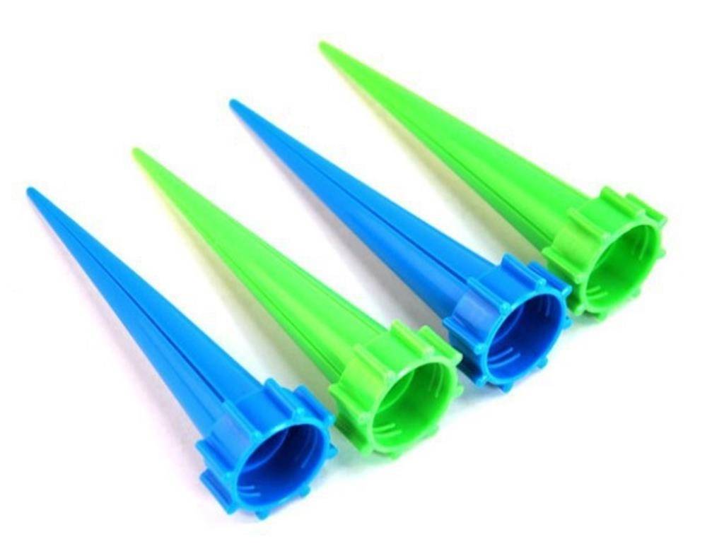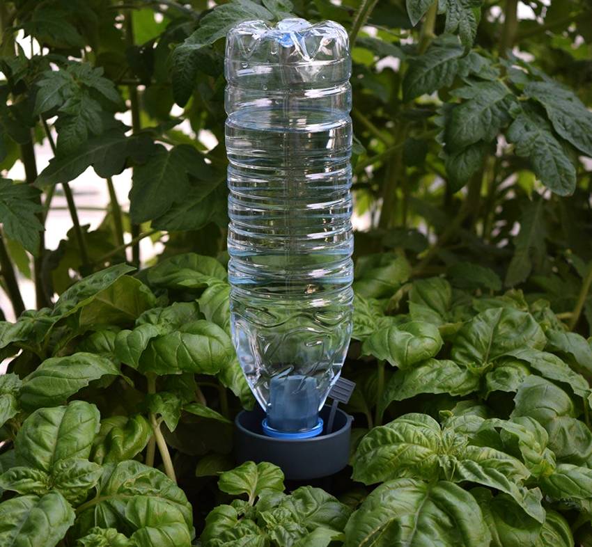 Избежать риска засорения бутылочных отверстий можно с помощью специальных пластиковых насадок в виде конуса. Они прикручиваются на горлышко бутылки вместо крышки, а вода поступает через отверстие в наконечнике. Такие мини-системы хороши для полива комнатных растений и цветов на клумбах. Бутылка втыкается в землю наконечником вниз под углом по направлению к корням растения, благодаря узкому длинному носику емкость не придется закапывать.