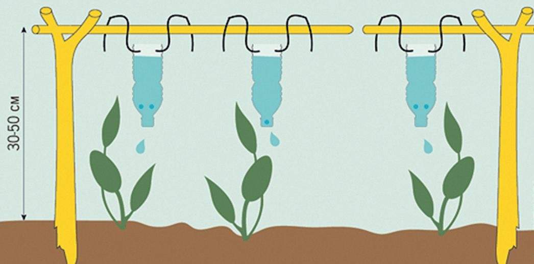 Такой способ чаще применяют в теплицах. Для него необходимо установить опору, вкопав по краям грядки трубы или толстые палки и укрепив на них длинную балку. На балку подвешиваются пластиковые бутылки горлышком вниз. Предварительно дно у бутылок срезается, в пробке и стенках проделываются отверстия.