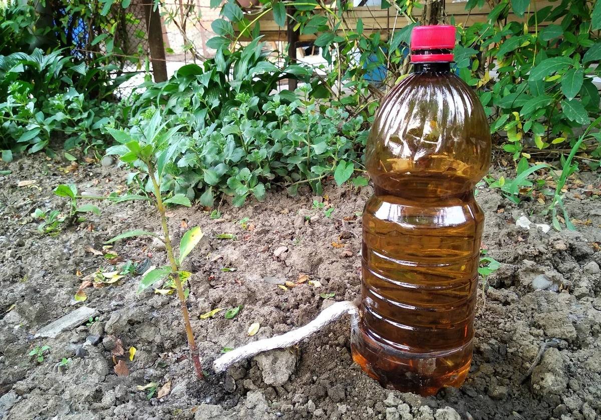 Закапываем бутылку с проделанными дырочками возле растений