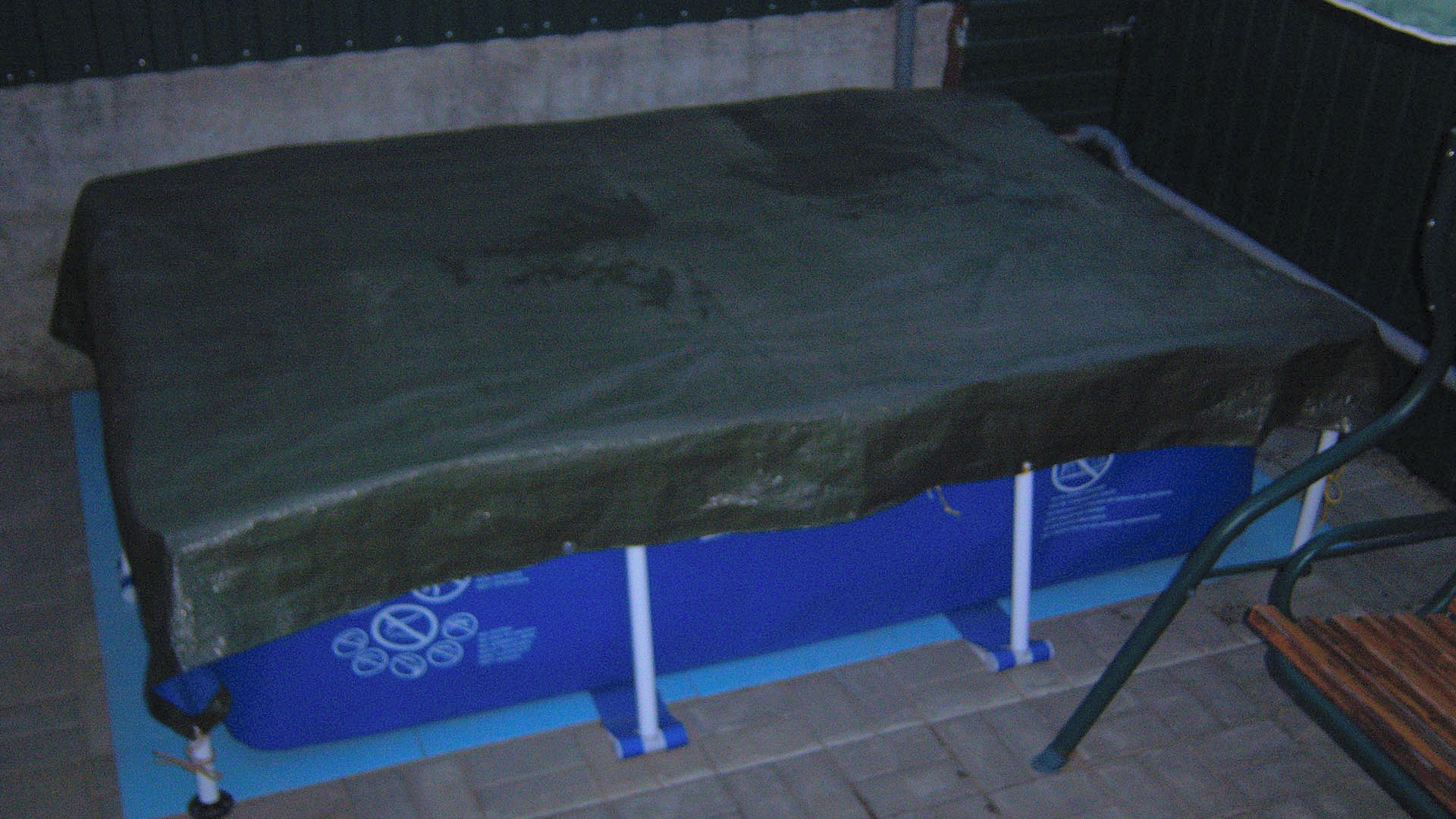 Во избежание попадания насекомых и пыли бассейн накрываем тентом