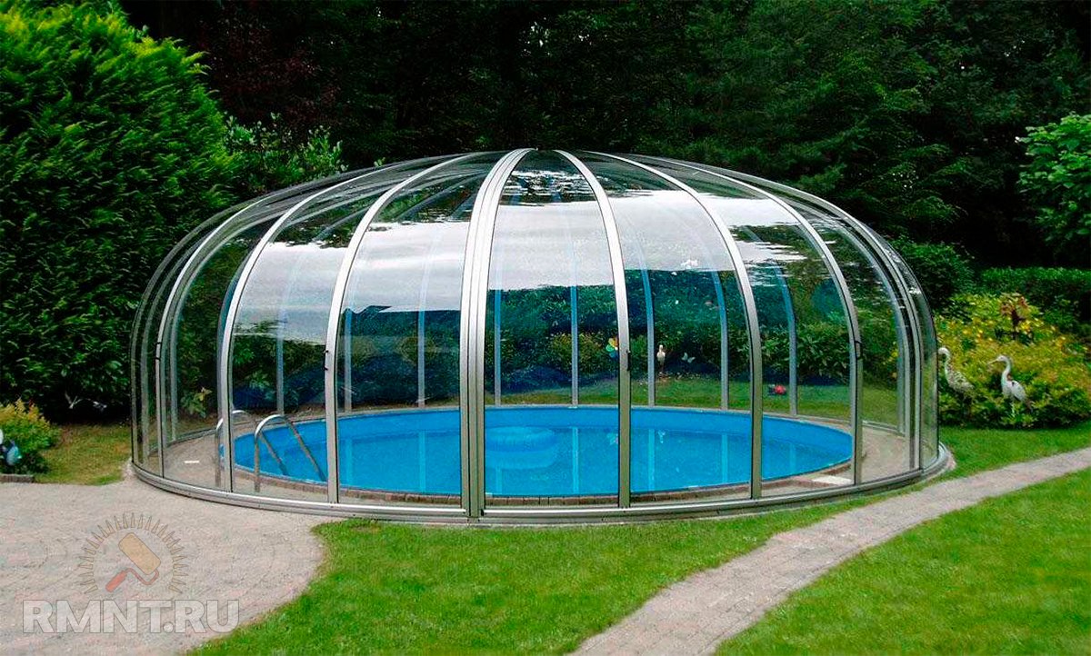 - Для бассейнов круглой формы очень часто используют куполообразную конструкцию. Стильное и интересное сооружение украсит любой приусадебный участок. Отличительная особенность данной конструкции состоит в сложном монтаже.
