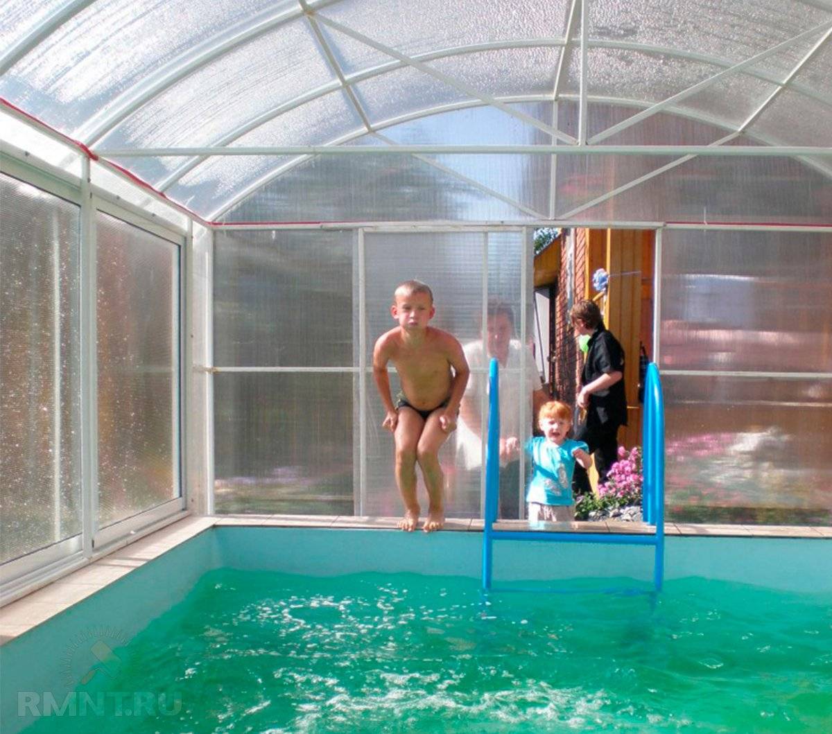 В целом же, теплица и сам бассейн под её защитой могут быть самой разной формы, из различных материалов. Главное, чтобы было удобно самим владельцам.