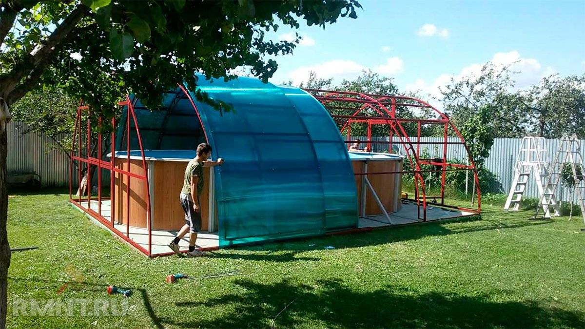 Портал Rmnt.ru уже подробно писал, как построить бассейн своими руками, уделив внимание всем этапам. Точно также мы писали и о строительстве теплицы, в частности, из поликарбоната на каркасе из профильной трубы