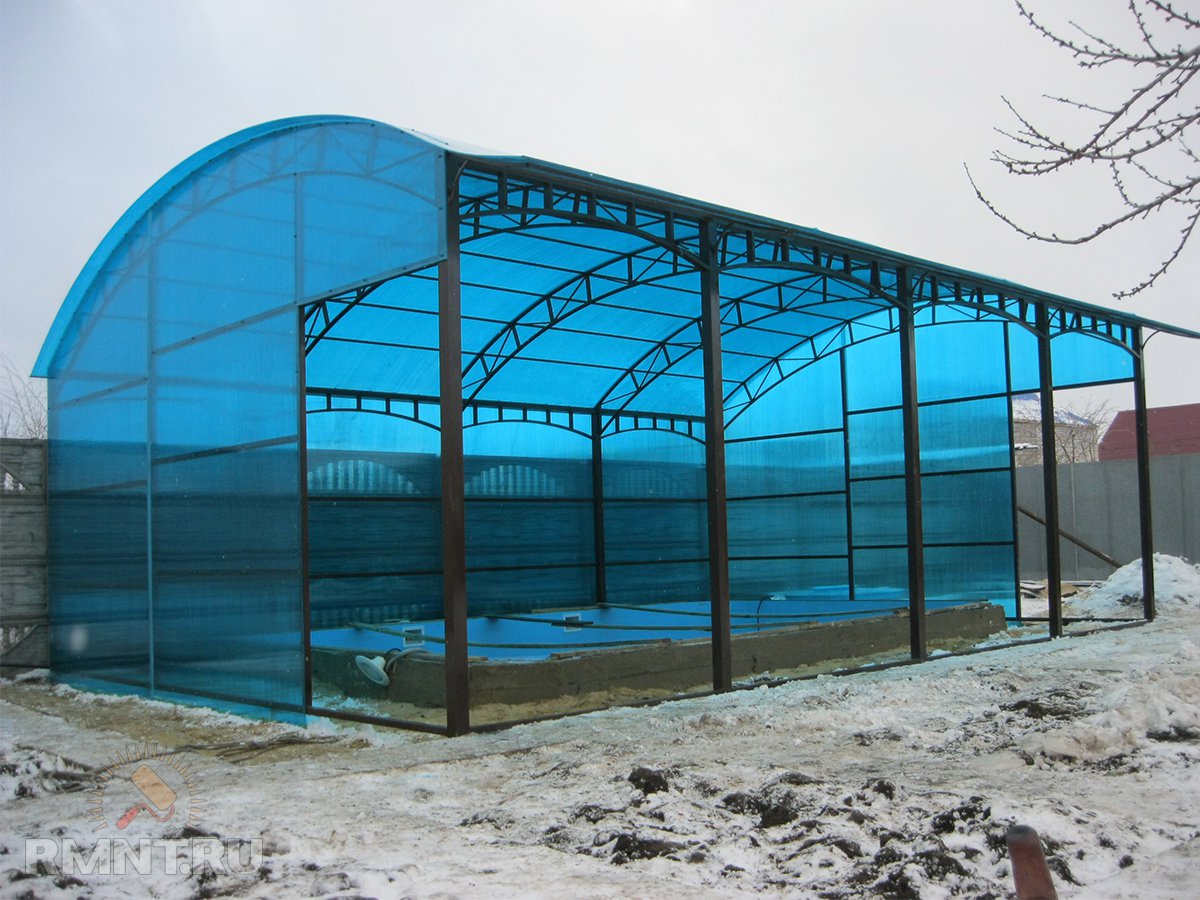 Самый популярный вариант — всё же теплицы из поликарбоната, возведённые над стационарным каркасным или бетонным бассейном. К их преимуществам относятся: