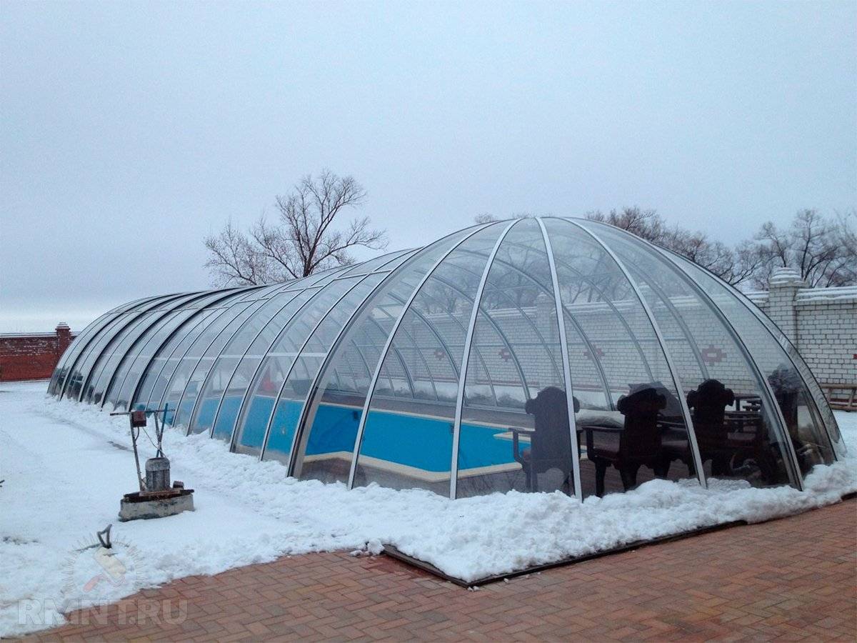 - куполообразные. Этот тип идеально подойдет для круглого бассейна. Такая конструкция невероятно сложная в исполнении, требует большого строительного умения и материалов. Именно поэтому зачастую пользователи выбирают прямоугольные каркасные бассейны в теплице;