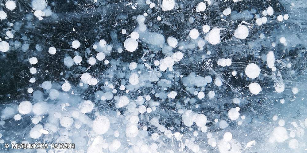 Пузырьки на Байкале ищут все туристы, потому что это очень необычное явление. Когда со дна озера на поверхность поднимается газ метан, он по дороге замерзает и превращается в такие белые пузыри. Если в местах скопления пузырей сделать отверстие и поднести спичку, то газ будет гореть как газовая конфорка. Такие небезопасные эксперименты даже снимали на видео. Вот такие они, пузыри:
