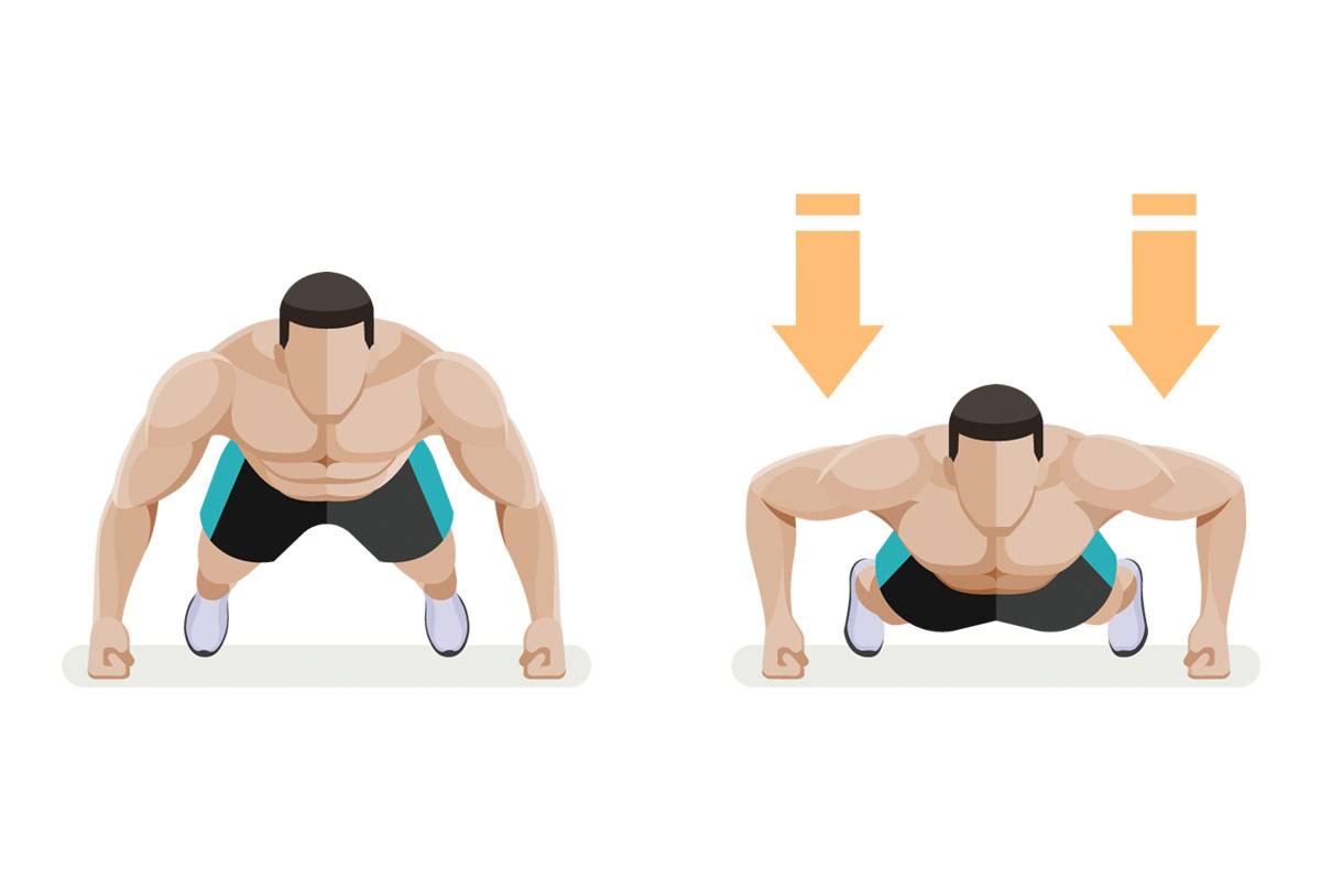 Упражнение для разминки и подготовки грудных мышц к тренировке. Варьируйте различные типы и ширину постановки рук, а также используйте подставку под ноги для усложнения. 2-3 подхода по 12-15 повторений