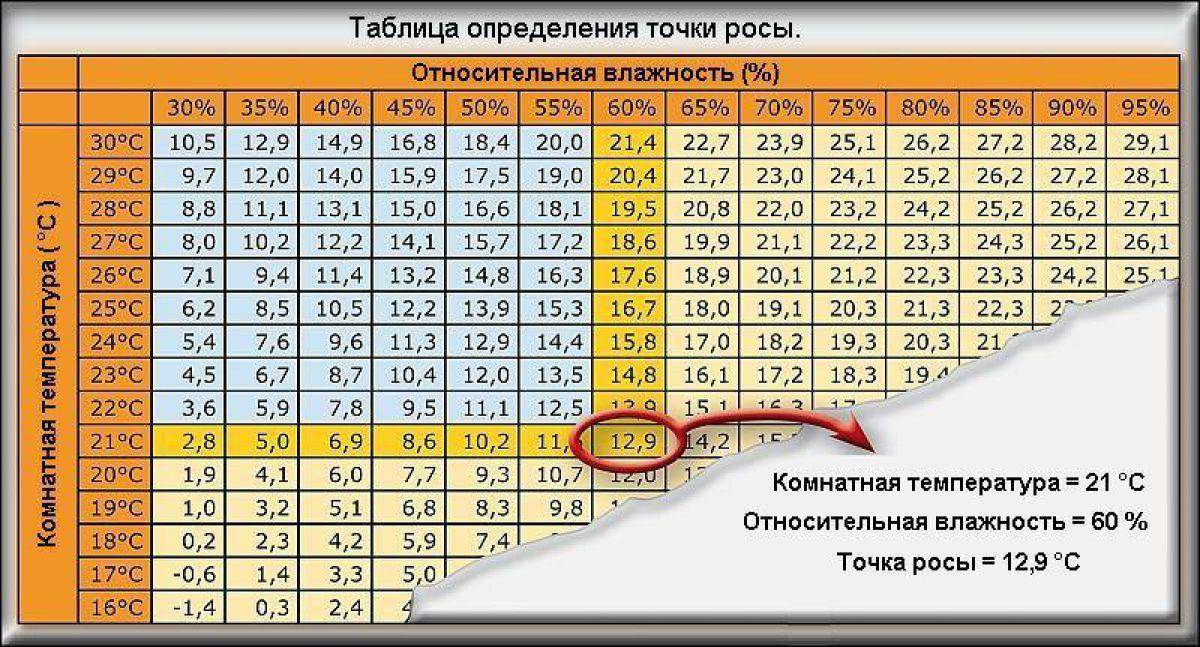Температуру, при которой формируется конденсат, называют «точкой росы». При этом есть прямая связь между относительной влажностью воздуха и температурой окружающей среды. В таблице ниже приведены данные для определения точки росы при разных условиях – температуре воздуха в помещении и относительной влажности. Если температура предмета равна температуре «точки росы» или ниже нее – на предмете неизбежно конденсируется влага.