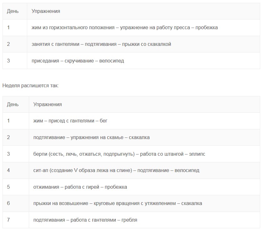 Для повышения эффективности предложенная программа тренировок может меняться раз в неделю. Упор разрешается делать на различные группы мышц — взрывную силу, просто силу, выносливость, скорость и так далее.