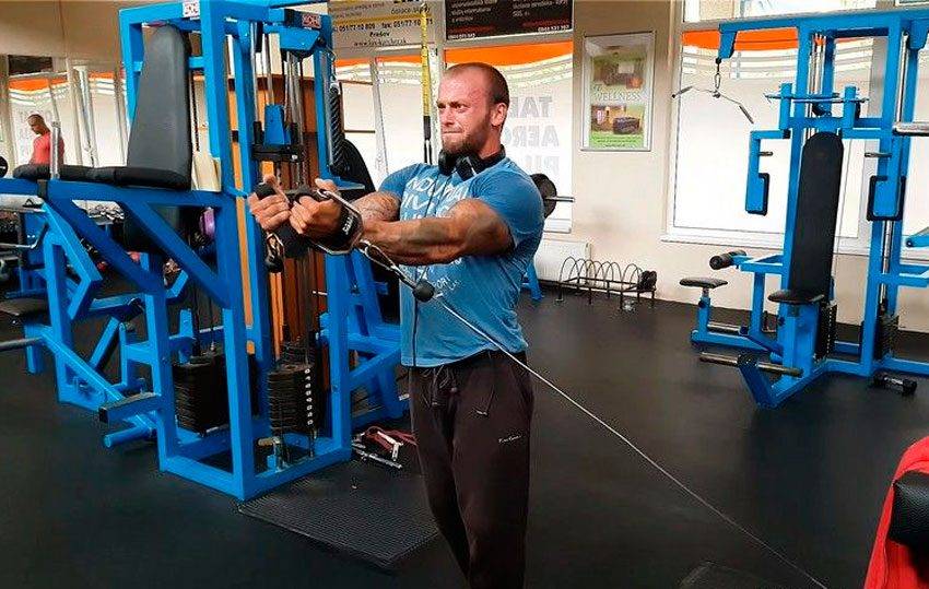 Исходное положение: рукоятки крепятся на линии, которая проходит через соски атлета. Далее работа напоминает тренировку в тренажере баттерфляй. Встать надо прямо, позвоночник перпендикулярен полу, руки развести в стороны, но не заводить за среднюю линию корпуса.