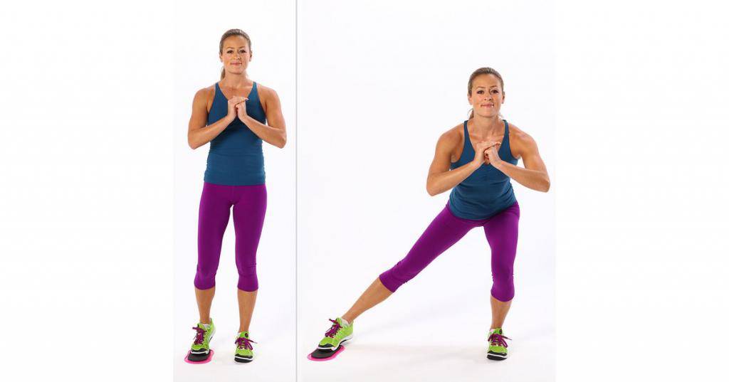 Боковые выпады поочередно выполняются каждой ногой.