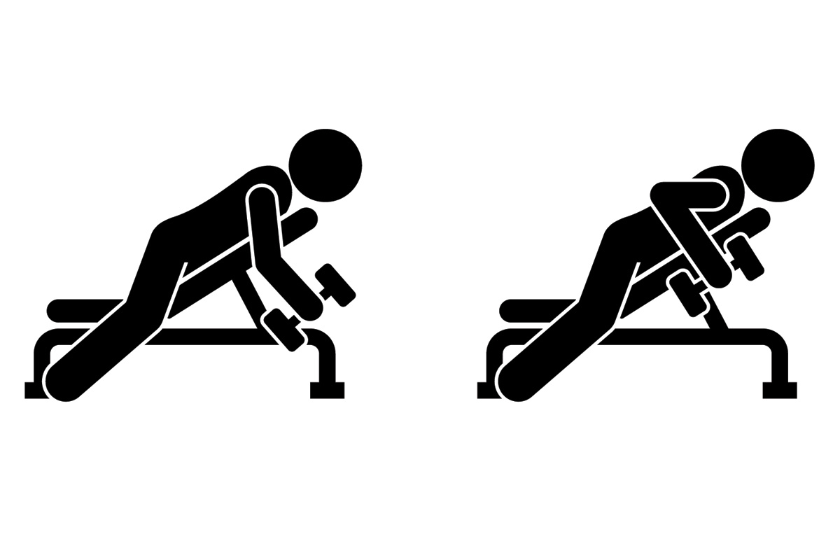 Вариация упражнения на скамье позволяет безопасно работать с большим рабочим весом. При тяге вверх лопатки сведены вместе.