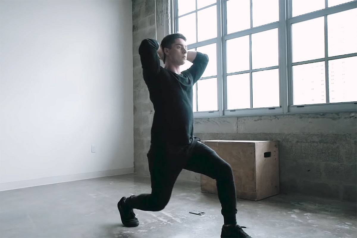Когда делаете выпады, следите за тем, чтобы в нижней точке бедро передней ноги было параллельно полу, а колено не выступало за носок. Скрепленные в замок руки за головой усложнят выполнение упражнения, так как потребуют дополнительного внимания для поддержания равновесия.