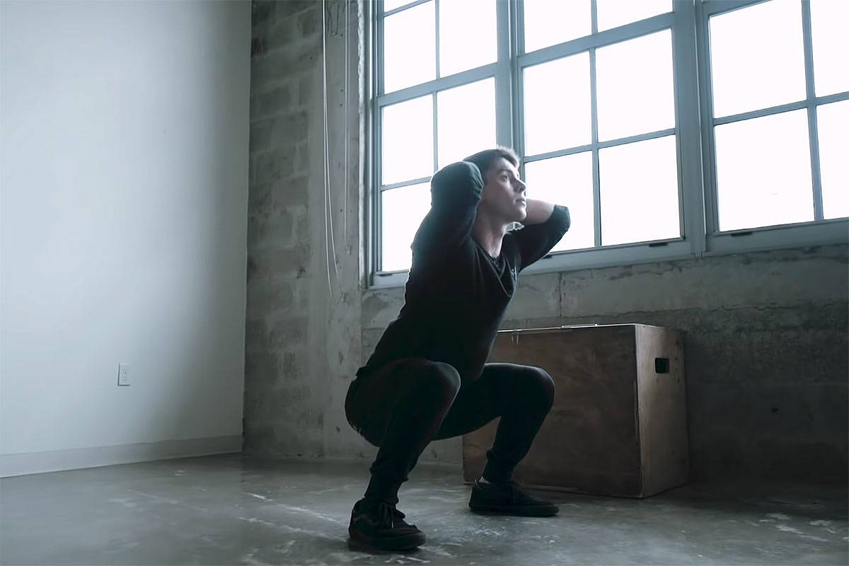 - Медленно «сползайте» вниз до тех пор, пока бедро не будет перпендикулярно голени.
