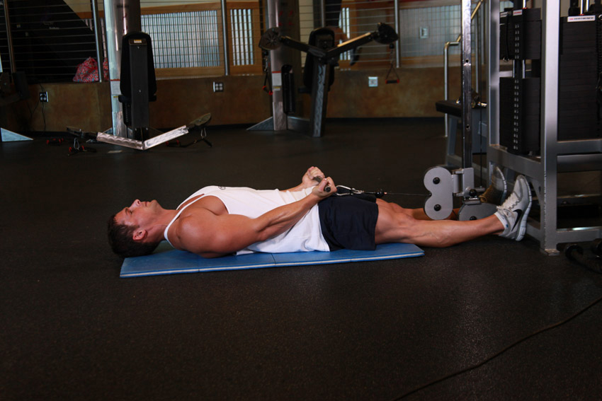 Сгибание рук на бицепс на блоке в положении лежа