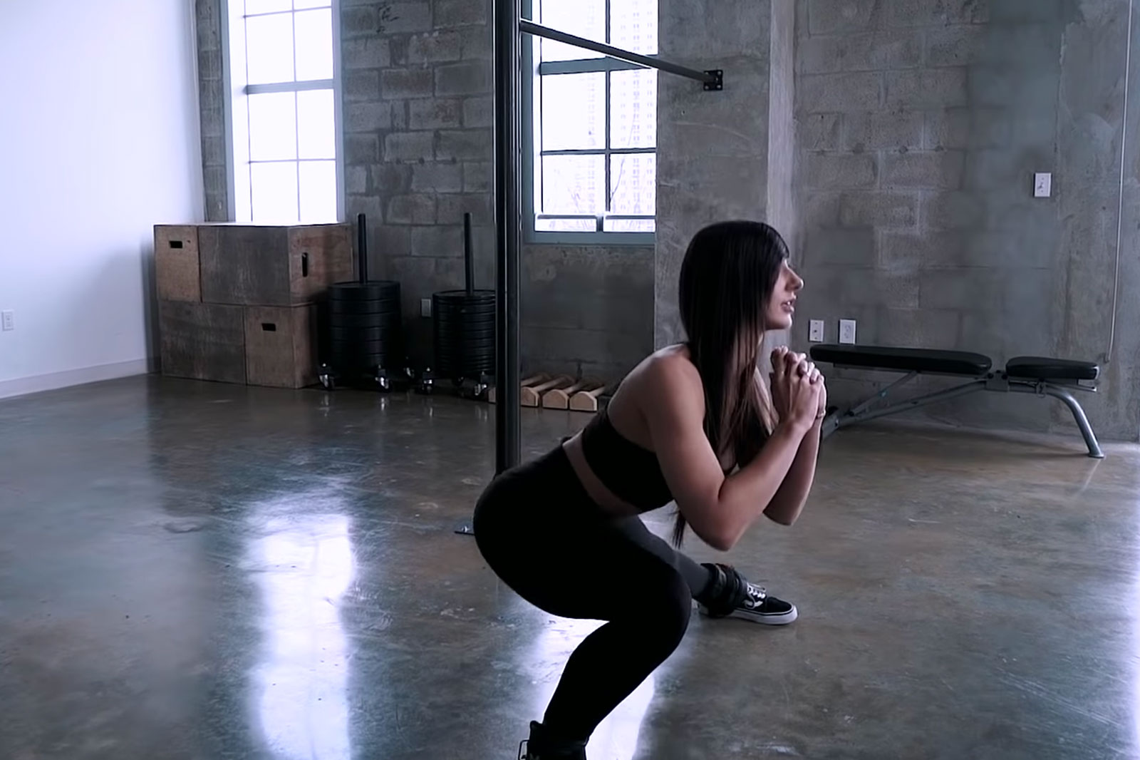 Обратите внимание на технику — чем вертикальнее положение корпуса во время приседания, тем больше нагрузка приходится на ягодичные мышцы. Не забывайте о дыхании: на приседании — делайте вдох, на выпрыгивании — выдох