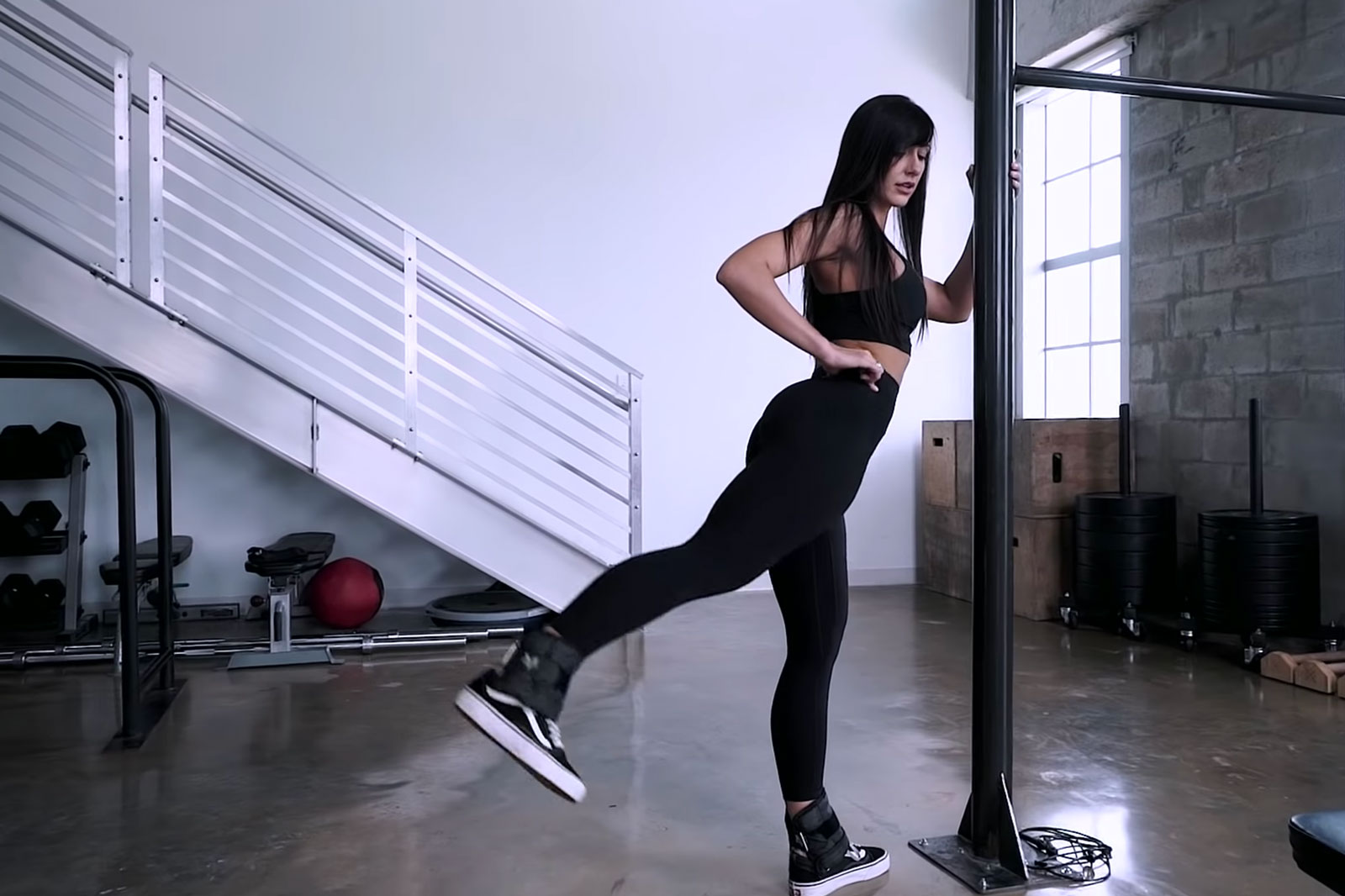 Сразу приступаем к махам стоя, чтобы добавить нагрузку на верхнюю часть ягодичных мышц. Делайте махи в диагональной амплитуде — отводите ногу назад и чуть в сторону. Старайтесь тянуться вверх внешней стороной стопы. Если под конец упражнения чувствуете жжение в ягодичных мышцах, то делаете все правильно.