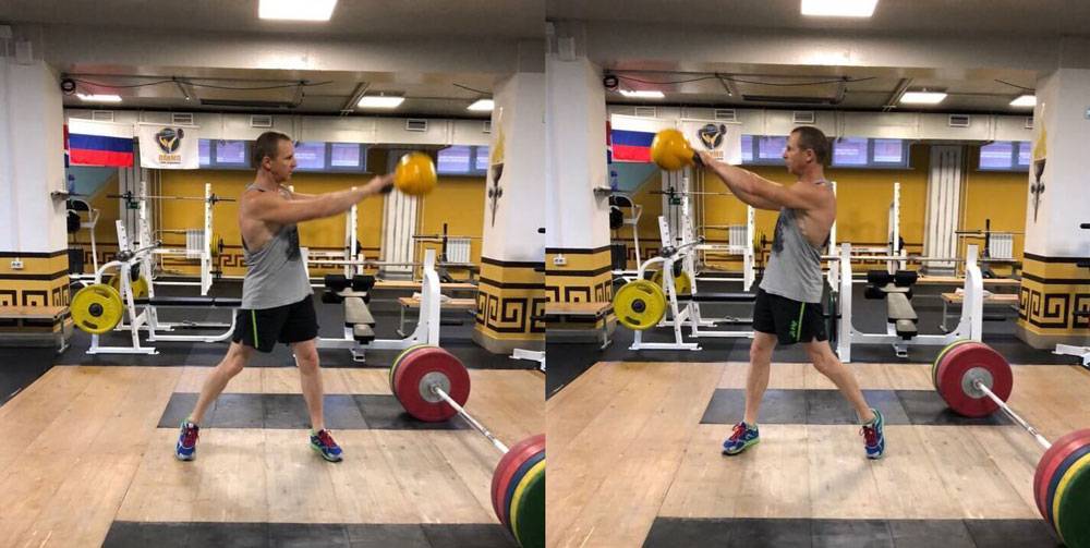 - Боковой выпад с жимом гири: 10-15 повторений (на каждую ногу)