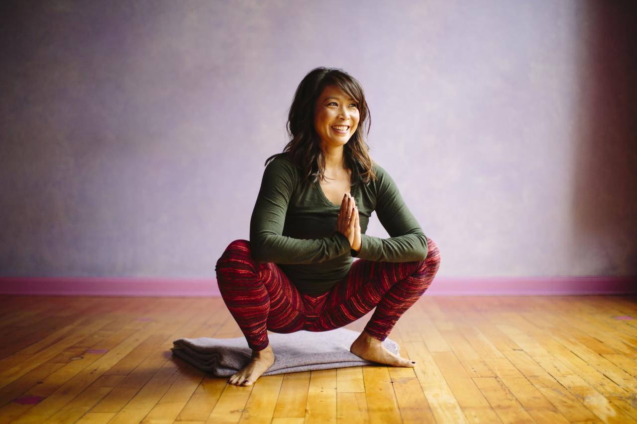 - Из тадосаны выполнить глубокое приседание, при этом стопы нужно держать вместе.