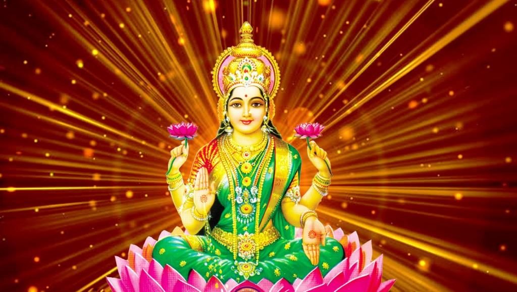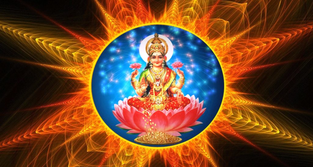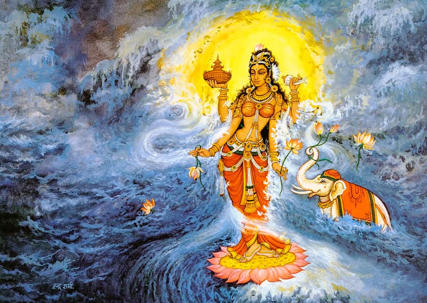 Шри Маха Лакшми — богиня богатства, удачи, роскоши и процветания (как материального, так и духовного). Она — воплощение любви и красоты, супруга и динамическая энергия Господа Вишну. Она вышла из океана во время великого «пахтанья», известного как Кшир-Сагара (молочный океан). «..Лакшми явилась вместе со священным эликсиром Амритой в цветке лотоса из океана молока».