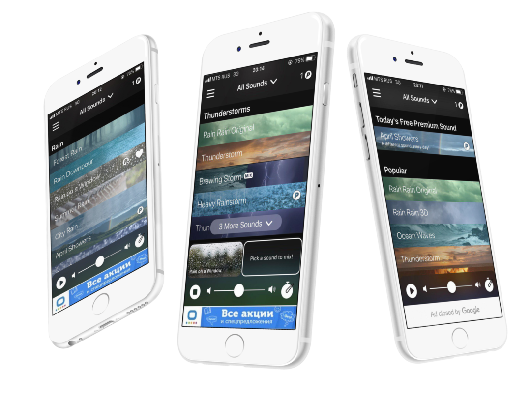 Приложение со звуками дождя и природы. Раньше мне казалось, что звуки дождя это звуки дождя. Что там ещё придумать? В приложении собрана коллекция дождя по крыше, дождя в лесу, дождя в городе, звуков дождя, бьющих по крыше палатки, шторма в заливе. Кроме того, там есть звуки костра с потрескивающимися головешками, водопадов, тающего снега, фонтанов, мурчащей кошки, морских чаек или тропических птичек.