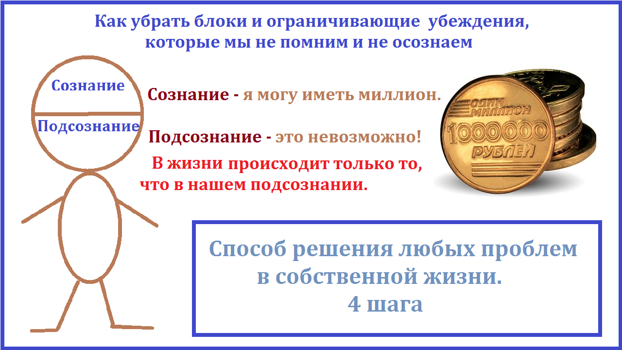 Что делать, если вы осознали свои психологическое установки? Как с ними работать? Например, у вас есть убеждение: «чтобы иметь семью, нужно отказаться от карьеры» или «для того, чтобы хорошо зарабатывать, нужно сутками пахать».