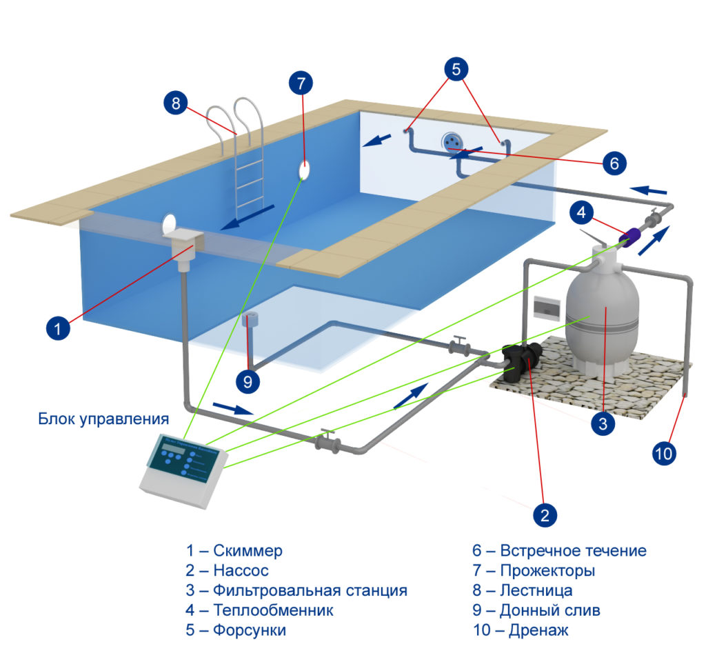 Итак, все бассейны состоят из нескольких систем, которые обеспечивают для вас чистоту и комфорт во время купания в воде.