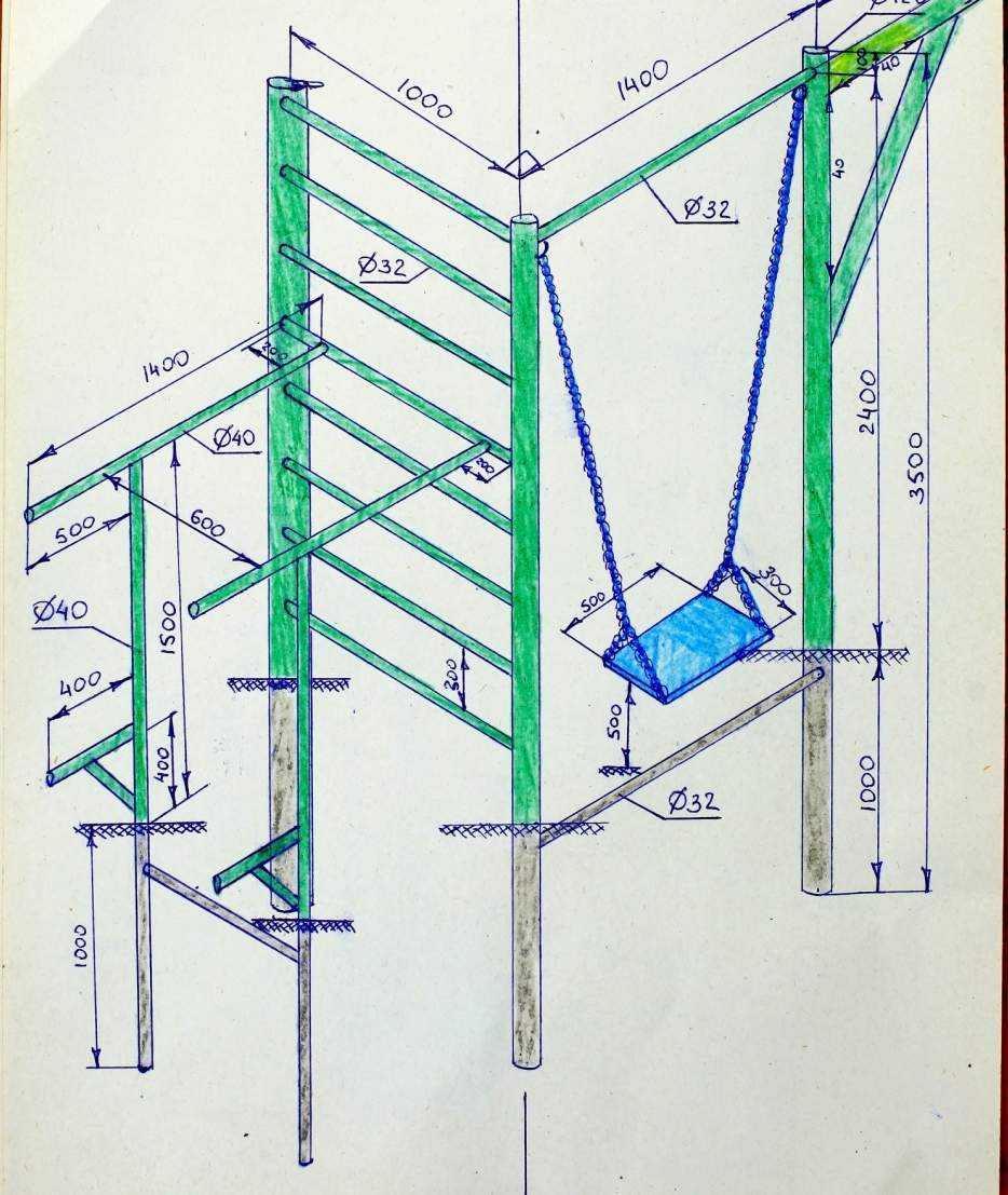 Схема и чертежи детского турника такого типа, совмещенного со шведской стенкой, приведены на рис. Трубы – сталь 20х1,5; деревянные детали – дубовая доска от 20 мм. Достаточная прочность и надежность обеспечены большим количеством точек крепления. Конструкция и соотношения размеров деталей установочных узлов позволяют выполнять и некоторые гимнастические упражнения.