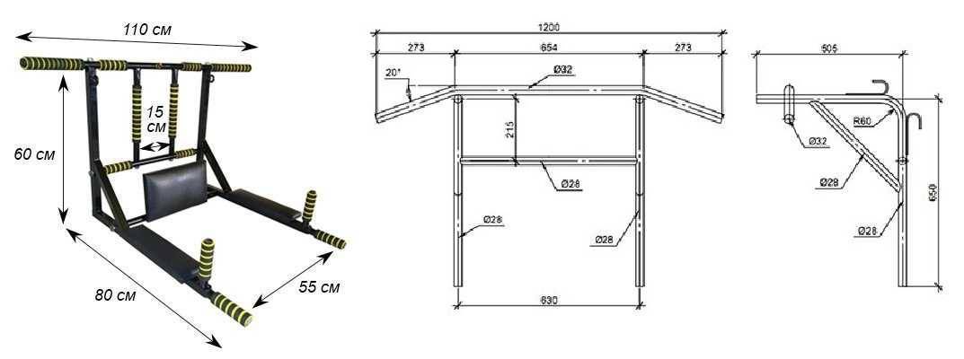 Стальная конструкция рассчитана на максимальный вес 110 кг. Все детали крепятся надежными болтами, перекладина покрыта мягким антискользящим материалом. Можно подтягиваться как широким, так и узким хватом. Подтягивания и упражнения на брусьях укрепляют трапециевидные мышцы, грудь, дельту, трицепсы. Удобные подлокотники и спинка позволяют выполнять упражнения на пресс. Присутствуют подставки для отжиманий, чтобы работать с большей нагрузкой.