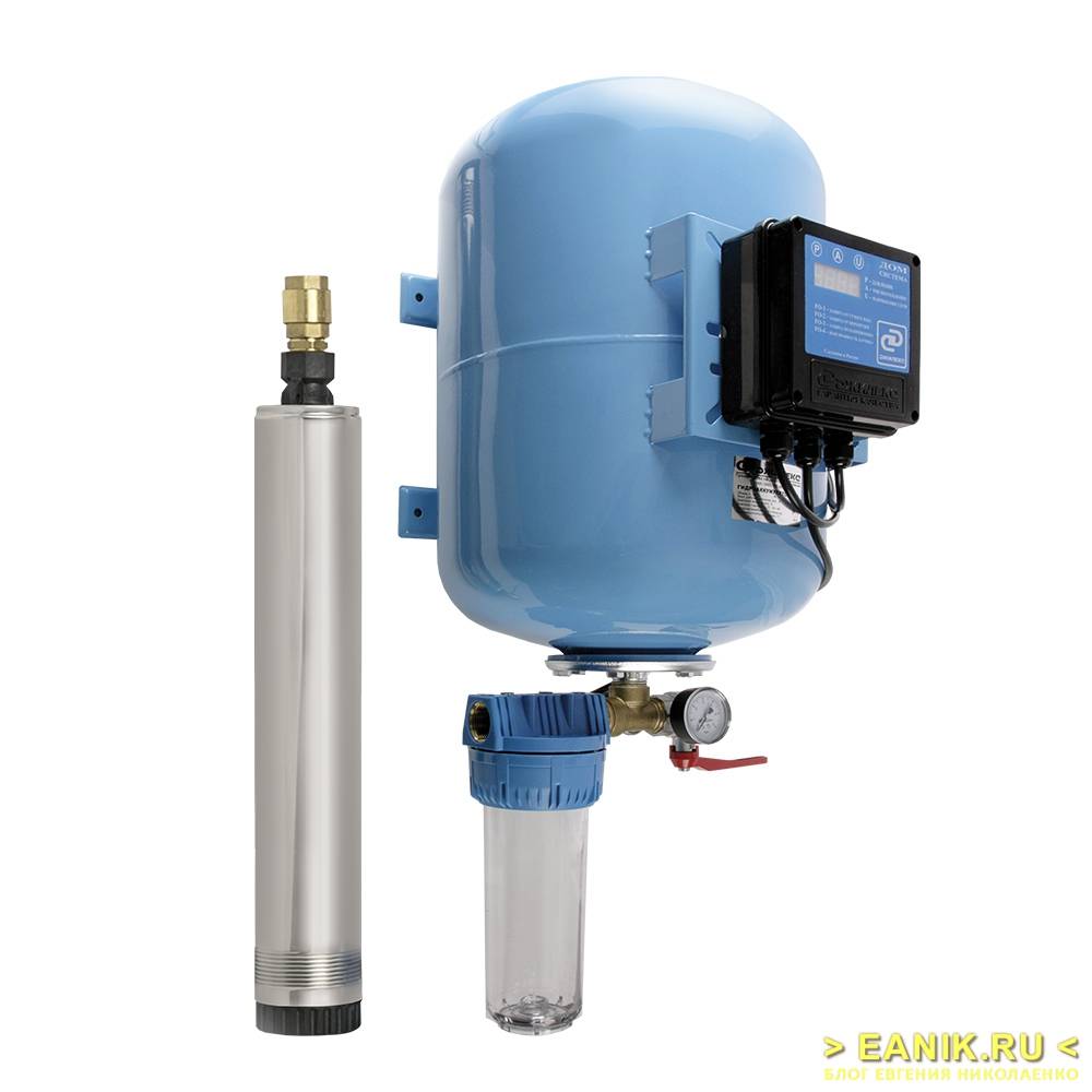 Помпа – классифицируется по типам (например, вихревая или центробежная), по месту расположения (поверхностная или погружная) и мощности. Для поддержания давления в системе используют дополнительные устройства. Гидроаккумулятор – бак с прочными стенками и резиновой мембраной служит для стабилизации водяного давления. Принцип работы: поступающая в емкость вода, растягивает упругую мембрану, после чего она стремится возвратиться в исходное положение, и выдавливает жидкость в трубопровод. Блок управления с механическим реле – отвечает за оптимальное функционирование гидроаккумулятора и помпы