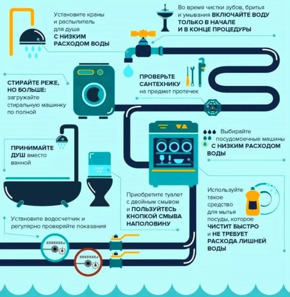 - Выбирать стиральную, посудомоечную и прочую бытовую технику с меньшим расходом воды. Большинство современных моделей соответствует этому требованию.