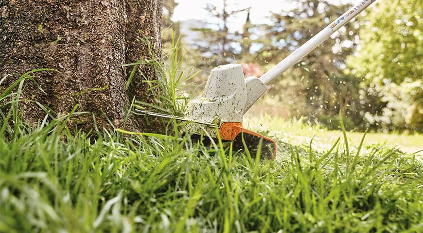 Не косите слишком близко к деревьям, бордюрам, цветочным клумбам, камням, оборудованию для игровых площадок, сараю или чему-либо еще. Вот для чего нужны косы с эластичной режущей гарнитурой, к примеру, катушкой с леской или пластиковыми ножами. Пытаясь подойти слишком близко к препятствиям, вы рискуете повредить их, режущий инструмент и/или себя.