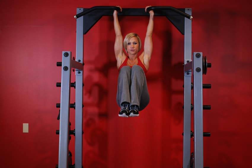 На шведской стенке. Как вариант — на перекладине. Необходимо взяться руками за турник, затем подтягивать согнутые в коленях ноги к животу. Так удастся проработать прямые мышцы брюшной стенки. Быстро прокачать боковые мышцы можно, если при подъеме попеременно поворачивать их то вправо, то влево. Выполнять упражнение следует 3 подхода по 15-20 повторений.