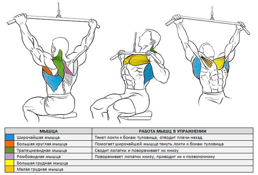 В тяге вертикального блока нагрузка смещается в зависимости от хвата перекладины и вектора движения.
