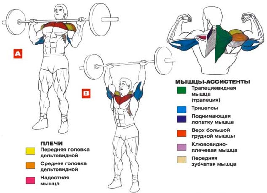 При этом в работу более активно включаются боковой и даже задние пучки дельтовидных мышц, которые слабо задействованы при жиме штанги от груди.