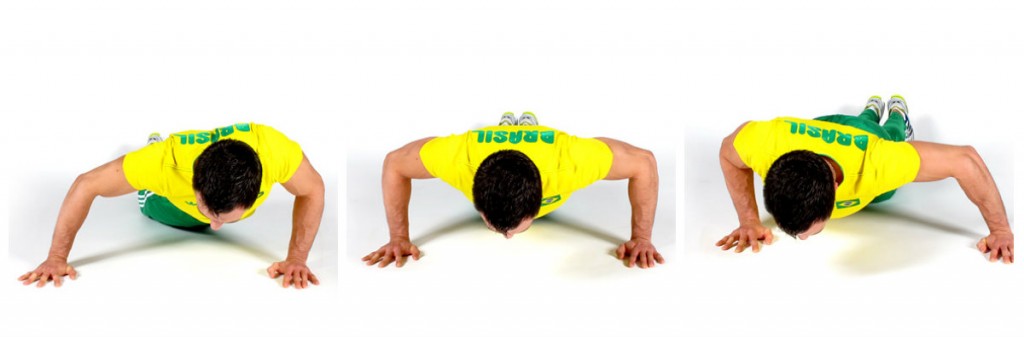 Задействованные мышцы: Данный вариант смещает акцент на верхнюю область грудных мышц. Упражнение является сложным, поскольку на руки здесь приходится большая часть веса тела.