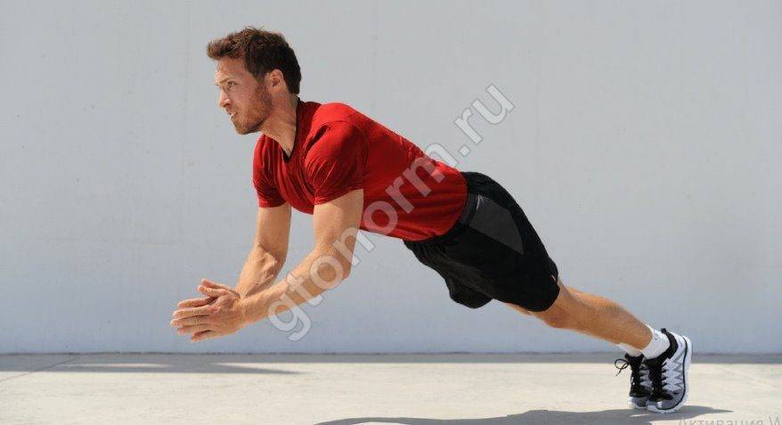 Примите исходное положение — упор лежа (на ладони), как и в обычных отжиманиях. Руки расставлены немного шире плеч, спина прямая, тело и ноги составляют одну линию.