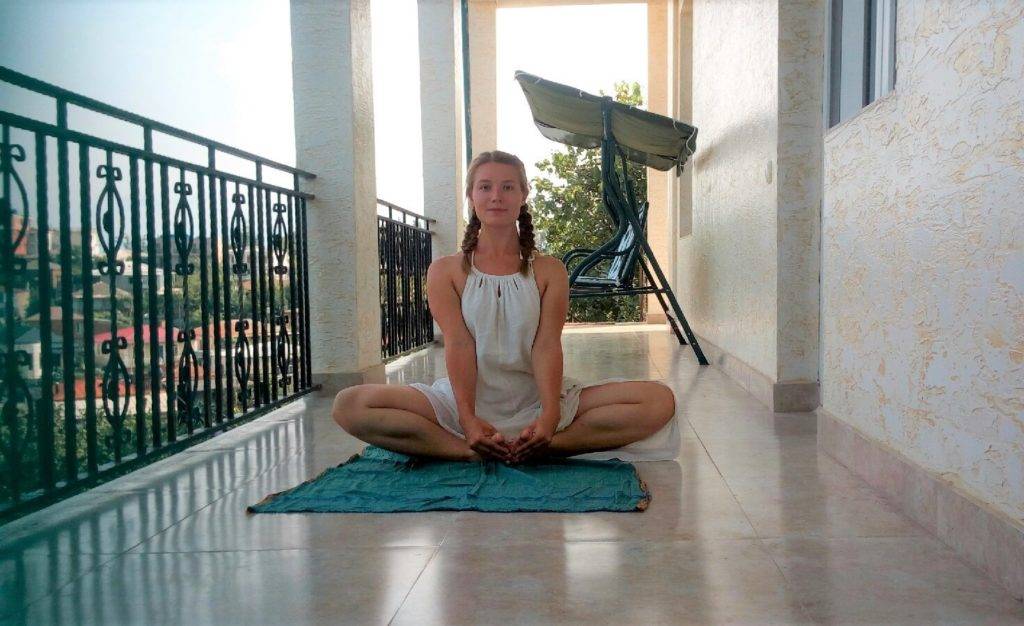 колени в стороны. Пятки уложите как можно ближе к промежности. - Соедините внешние края стоп,