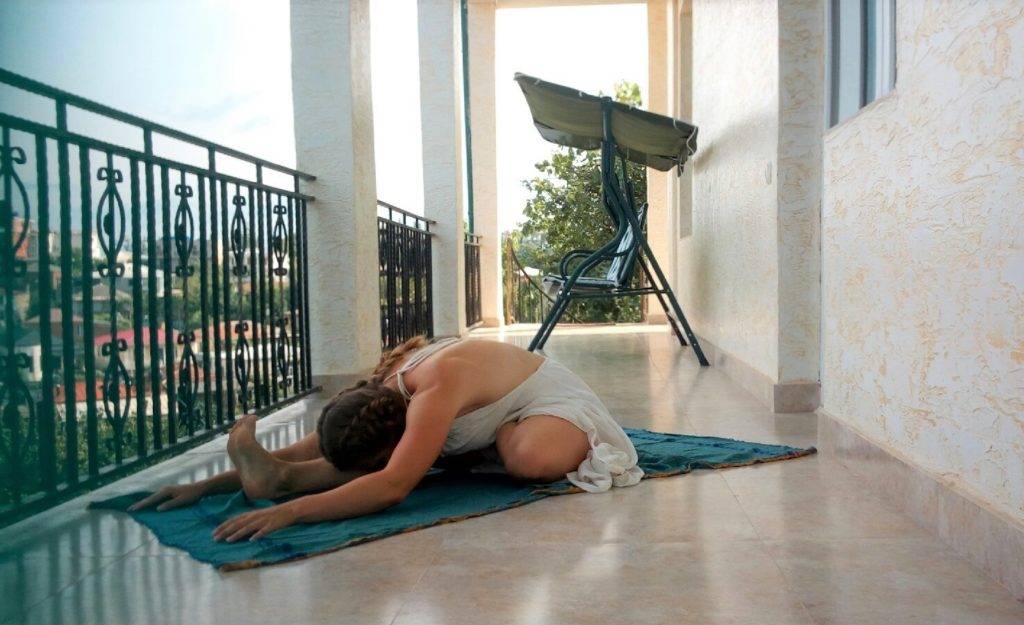 Активно тянитесь кончиками пальцев ступней в пол, старайтесь уложить подошвы ступней полностью в пол.