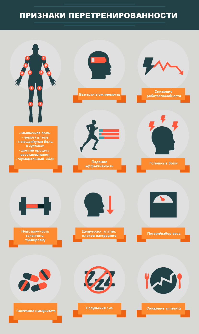 Ну что ж, мы узнали механизмы возникновения, а также характерные симптомы перетренированности. Чтобы легче было запомнить все симптомы, смотрим на инфографику (кликабельно):