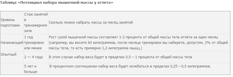 Все разговоры о 10 кг мышечной массы, прибавленных якобы за полтора-два месяца упорного тренинга без стероидов или похудении, относятся к жанру ненаучной фантастики. За неделю, максимальный вес, (имеется ввиду: сухая мышечная масса) который человек сможет набрать колеблется примерно в пределах от 0,5 – 1 килограммов. Да, к сожалению, накачать огромные мышцы за неделю или за месяц не получиться. Из этого следует, что максимум, что человек сможет набрать за один месяц, это 4 — 5 килограммов сухих мышц.