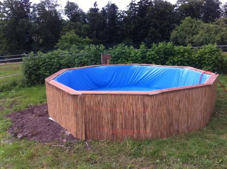 Однако каркас из труб (или из поддонов) с пленкой был отвергнут, поскольку такую конструкцию сложно назвать надежной и долговечной. Служить экспресс-бассейн будет до первого прокола, а организовывать его полноценную очистку с фильтрацией нерентабельно.