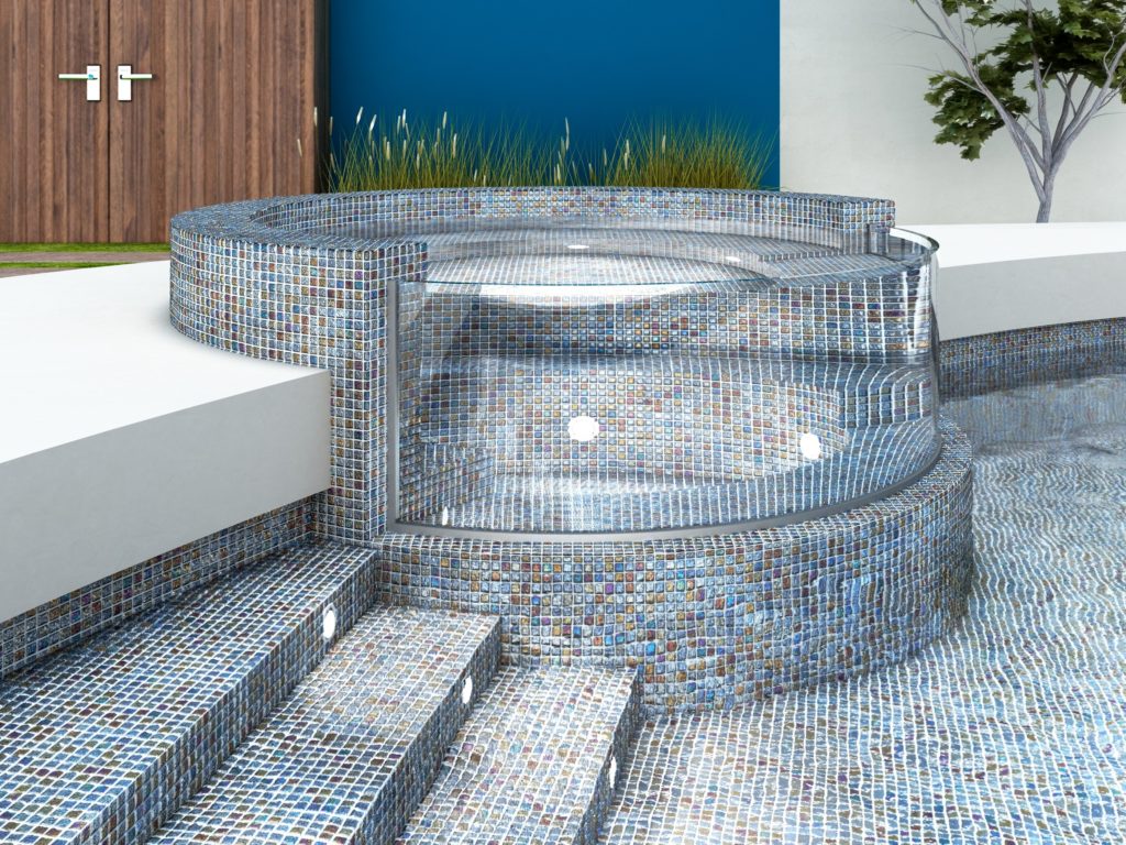 Стеклянная плитка (мозаика) является самым красивым материалом для отделки. Она устойчива не только в воде, но и к солнцу и микроорганизмам.